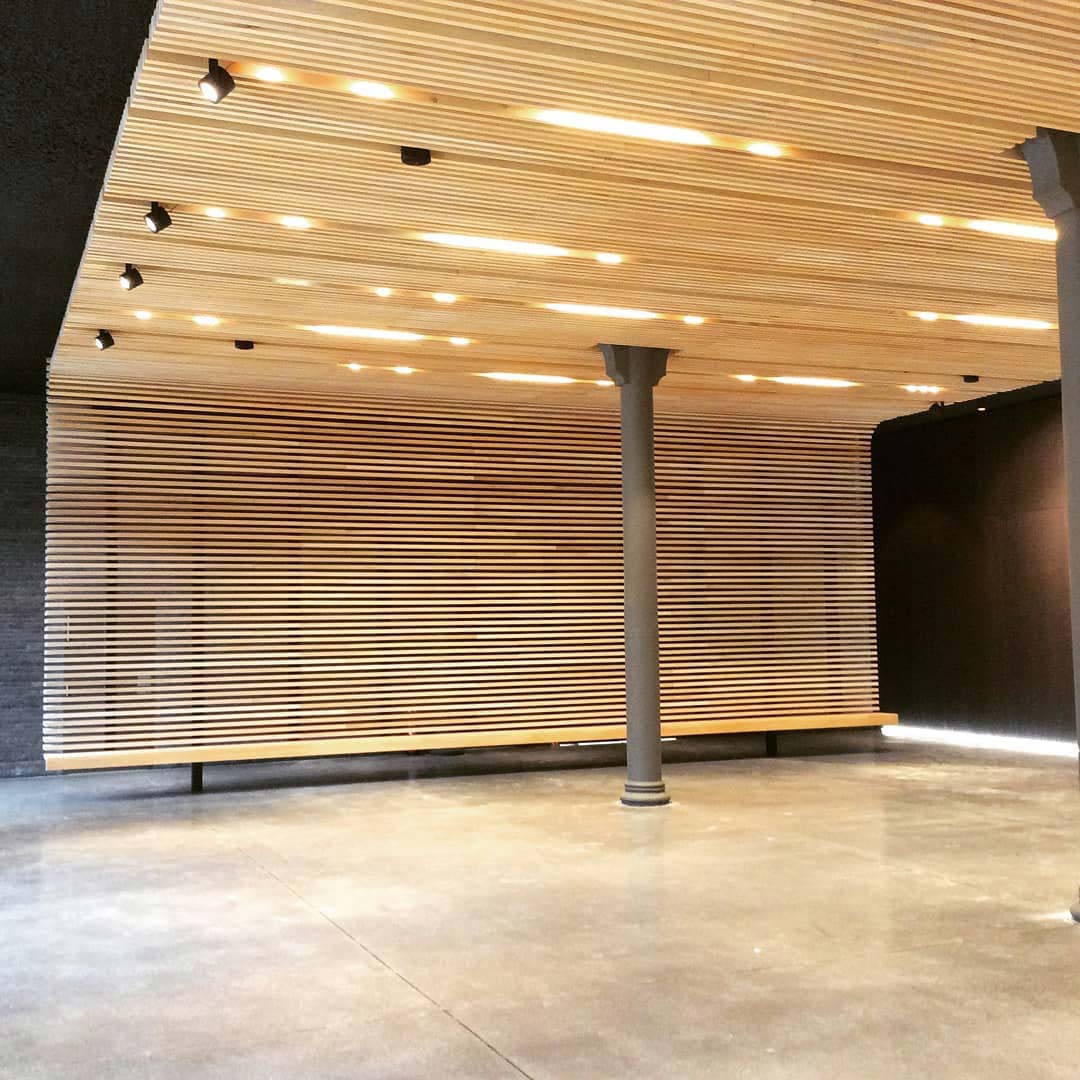 Plafond en tasseaux bois, contre-cloison en placage micro-perforée - Thomas architectes, Champagne Roederer