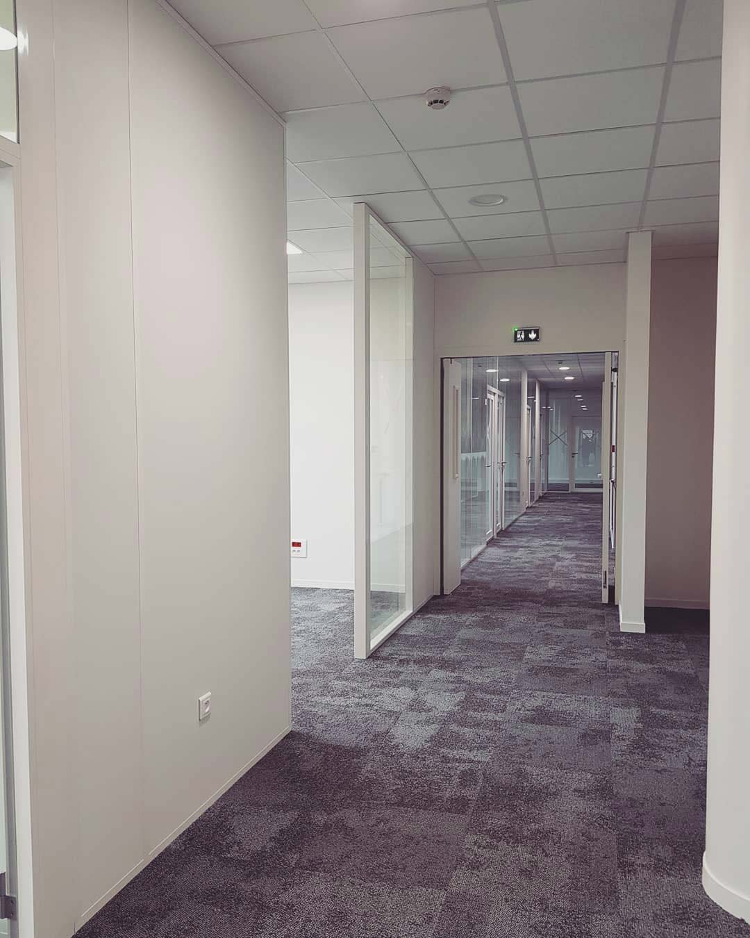 Aménagement d'un palier en zone bureau, parquet, habillage d'escalier - Haïku architectes